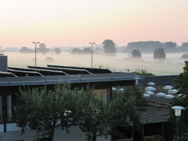 Nassenfels hat ein besonders schönes Pfarrheim am Hang über dem Schuttertal. Von einer großen Terrasse kann man über das ganze Tal schauen. Das Foto rechts zeigt das Gebäude hinter den Bäumen und die Aussicht in das Moor mit Frühnebel.