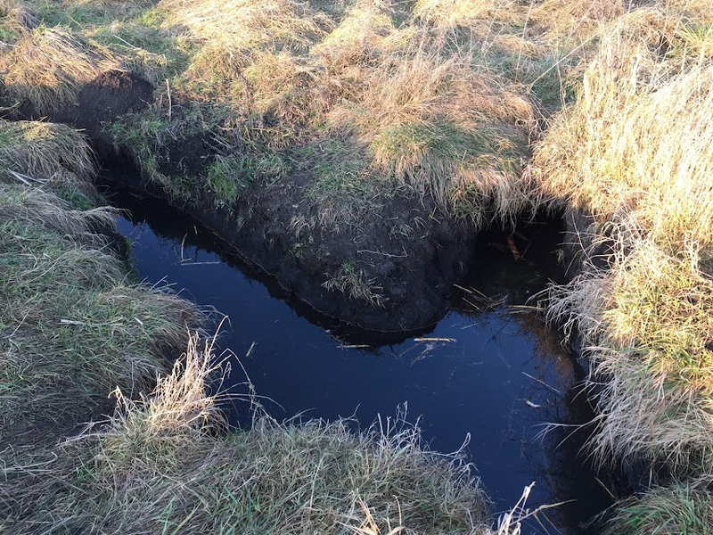 - Ein kleiner Teil der Fläche ist vom Landgraben und zwei Gräben umflossen. Hier soll eine „Entbuschung der Fläche bzw. Zurückdrängen des Weidengebüsches“ sowie eine „Mahd mit Abtransport des Mähgutes“ stattfinden. Doch diese Fläche ist die Heimat einer Biberkolonie! Die Tiere haben hier zahllose Tunnel und Gräben geschaffen. Traktoren oder Mähgeräte haben auf der Fläche keine Chance. Wenn die Ausgleichsfläche wie geplant realisiert wird, werden mehrere Biberfamilien vertrieben. Was das für die Tiere bedeutet, kann man hier nachlesen: Biber im Moor